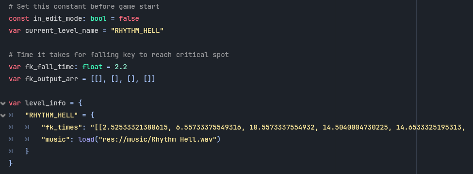 The way the code works is we have a script called level editor which holds the code to each level and the rate at which each key falls and hits the center of the main arrow keys. At the top of the code there is a bool that we set to either true or false.